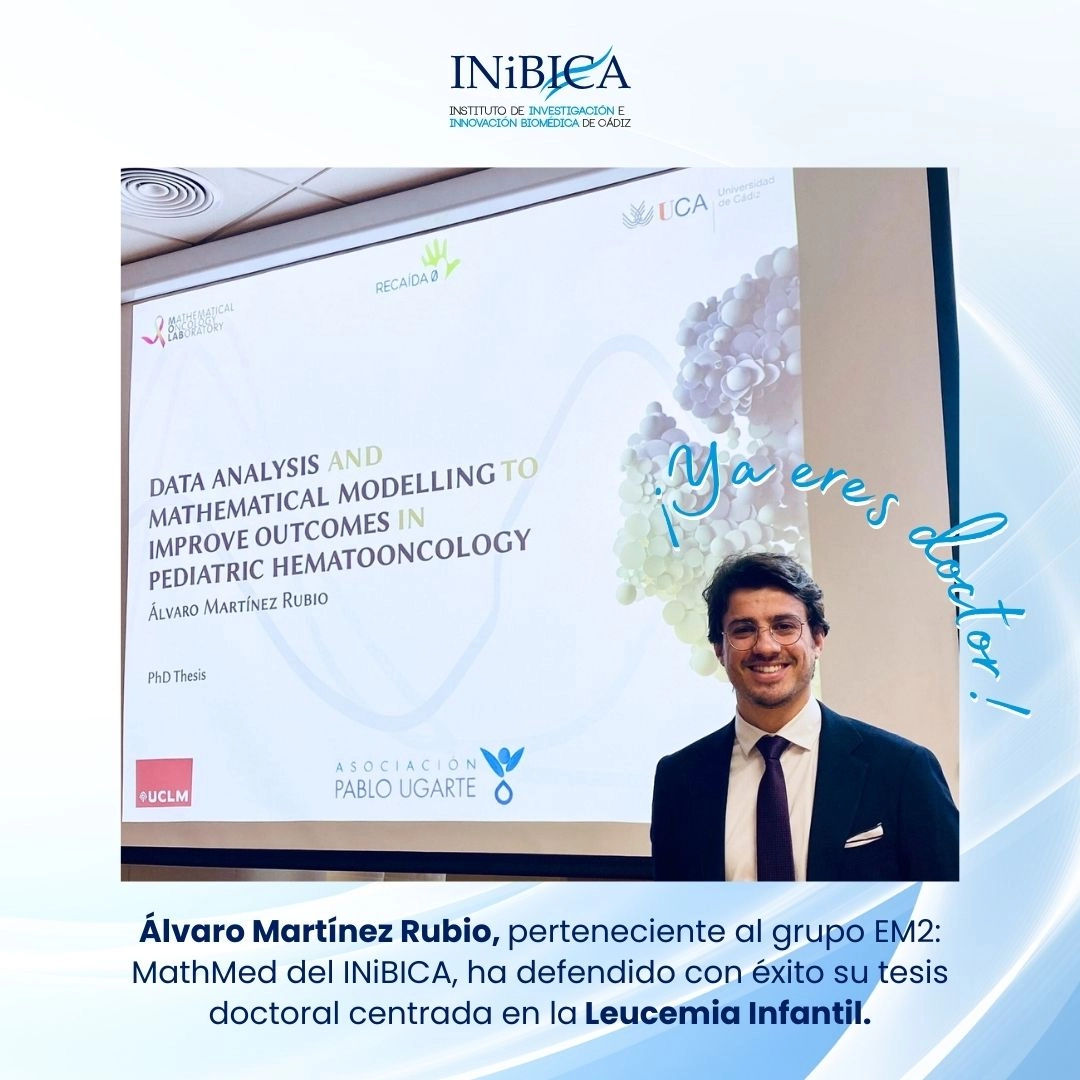 📊 Álvaro, graduado en Física con Máster en Matemática Aplicada, investigador de la Universidad de Cádiz para el desarrollo de modelos de leucemia y perteneciente al grupo EM2: MathMed, cuya investigadora principal es María Rosa Durán, ha defendido con éxito su tesis doctoral centrada en la #LeucemiaInfantil🎗️